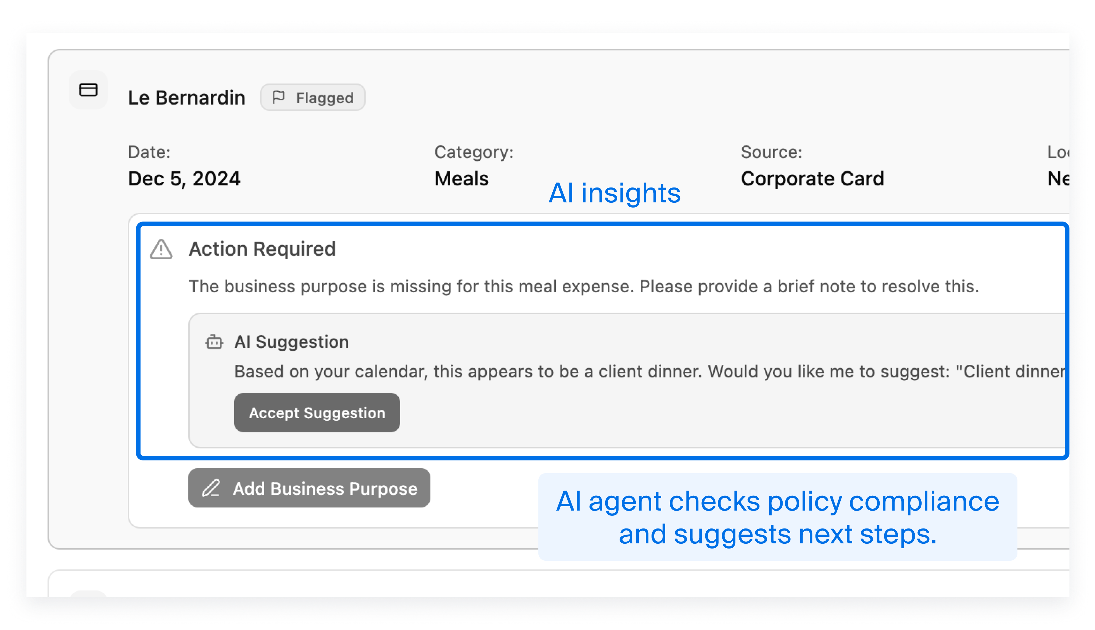 Supports trip expense approvals by checking expenses and surfacing key insights such as flagged points. It recommends next steps based on context and relevant history.